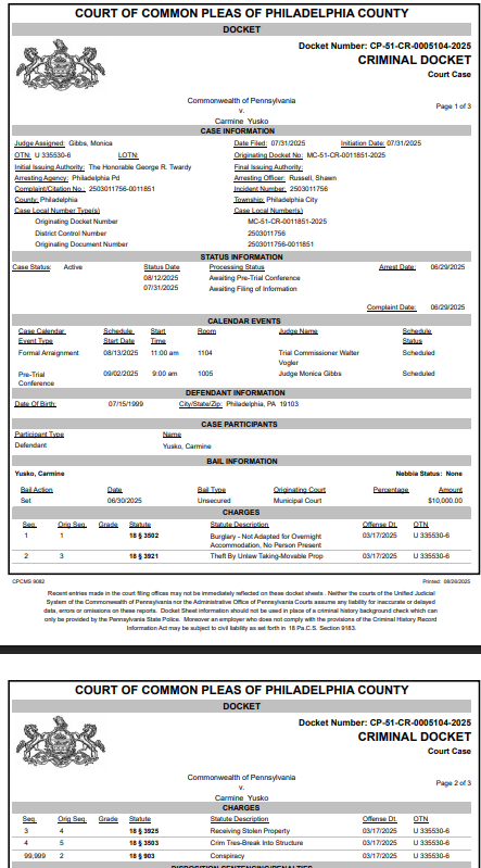 Feel free to fact-check this yourselves: here’s a direct link to the docket. Or, head over to the Pennsylvania UJS Portal, search by Participant Name, enter his name (“Carmine” for first, “Yusko” for last), then choose “Active” for Case Status. The resulting docket, which was filed on July 31, 2025, is the one I am referencing for this post. As of now it’s the only docket in the system (under Active, anyway…feel free to take a peek under Inactive if you want to see how he handles his responsibilities as they pertain to driving infractions and those resulting warrants), but as anyone who knows Carmine knows, he’s quite the busy bee, so it’s only a matter of time before more charges show up.