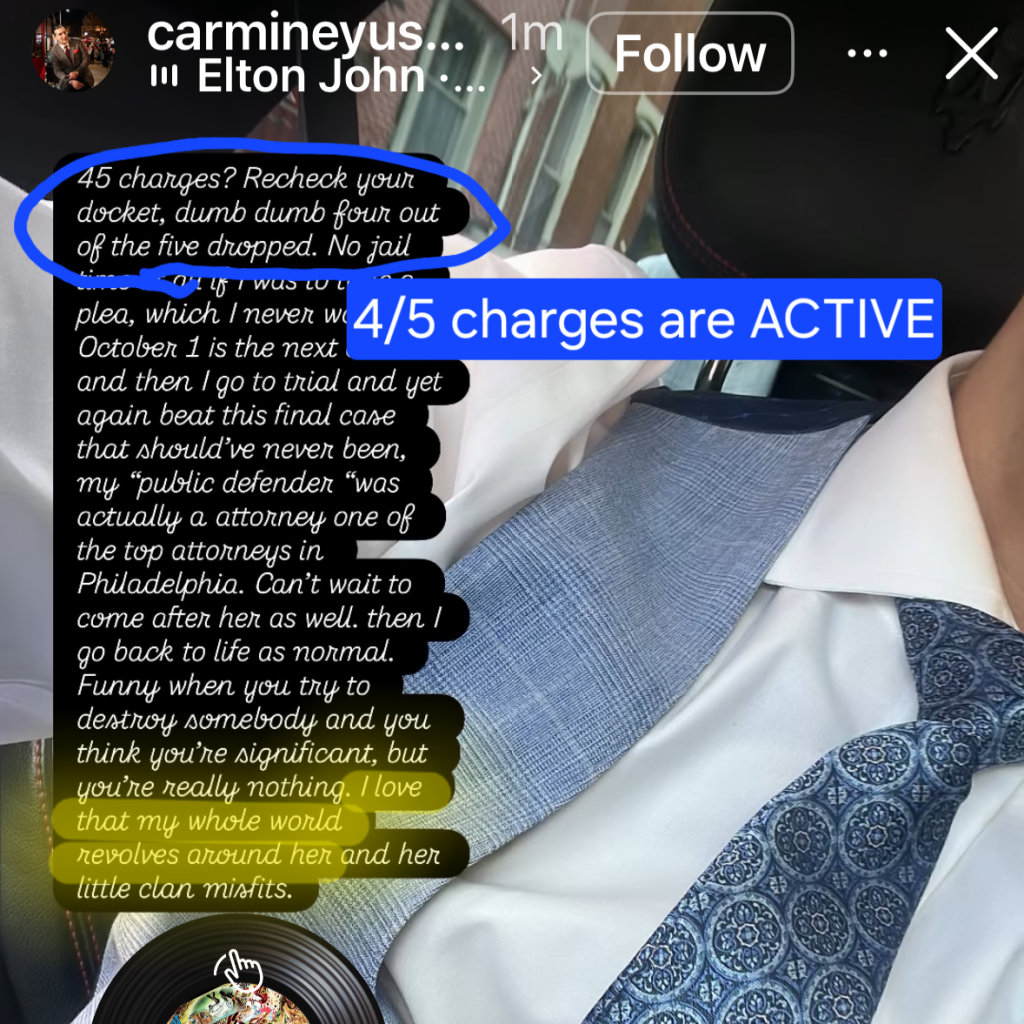 Carmine seems to think dragging things out will somehow make these charges magically go away. As it is, he is applying magical thinking by telling others via social media that “four out of five charges” were “dropped”, when the truth is the opposite: four out of five charges STUCK – they aren’t going away until he deals with them in court. Here is a direct link to the docket he advised us all to re-check. You can also pull up that docket yourself by visiting the Pennsylvania United Judicial System Portal, choosing to search by Participant Name, entering his information (Carmine Yusko), and setting the Case Status to Active. (For shits and giggles, switch the Case Status to Inactive and you’ll see his two traffic tickets from May. PSA: many magisterial courts issue warrants after 30+ days for failure-to-respond (FTR), and those back-to-back tickets were acquired three months ago. A continued lack of response may also result in one’s driver’s license being suspended. What a great job you’re doing being a responsible adult, Carmine. I can see exactly what a woman a decade older sees in you and what you bring to the table (I’m guessing lines, and not much else except perhaps some love-bombing so she’ll open her wallet, legs, and home to you? I get it, I guess – hobos gotta hobo somehow, and since I made sure your shenanigans with my brother, Charisma, and your other victims cost you your rent-to-own rental, you need to crash somewhere. What happened to Daddy’s little shoebox on Pine Street?).
