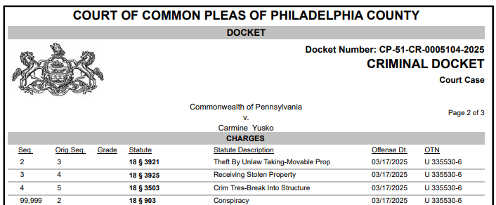 Carmine Salvatore Yusko, south Philly’s fav hobosexual that makes check-cashing places lock up their drawers and women going through mid-life crises drop theirs, is dragging out the judicial process, and we’re curious to see how it plays out. He is facing four charges (originally five; but the fifth, Conspiracy, unfortunately did not stick due to insufficient evidence) for breaking into a storage unit and stealing thousands of dollars worth of tools from it in March of 2025: